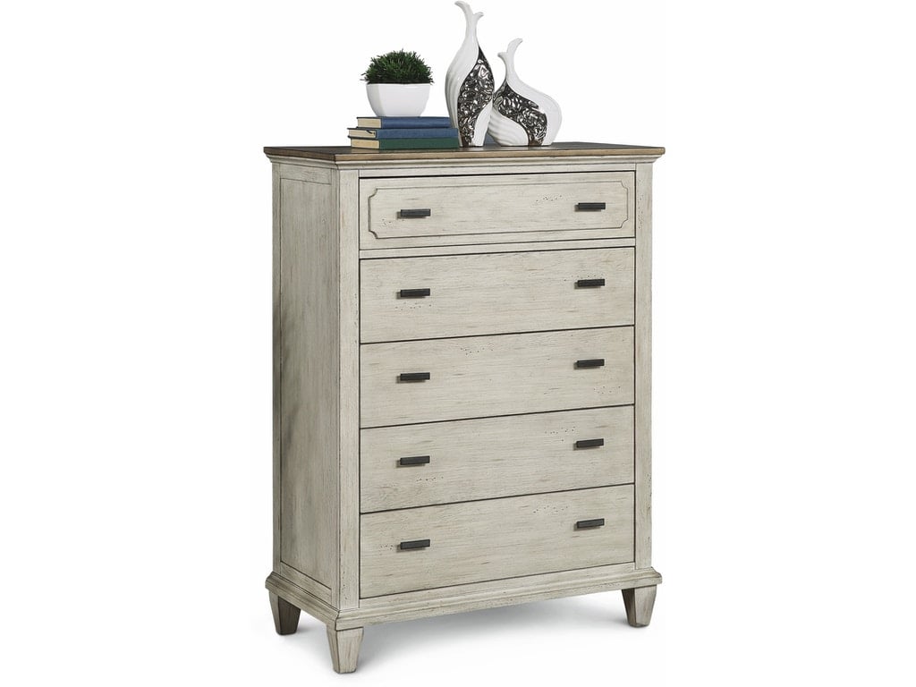 Product Description: Cozy and casual elements converge to bring a coastal cottage look to any bedroom space-even those with smaller footprints. The Newport drawer chest features five roomy drawers, with a felt-lined top drawer for functional storage. A bright, weathered finish, scalloped top drawer detail, and contrasting gunmetal hardware add to the effortlessly chic style. Width: 37″ (94 cm) Depth: 18″ (45.7 cm) Height: 50″ (127 cm)